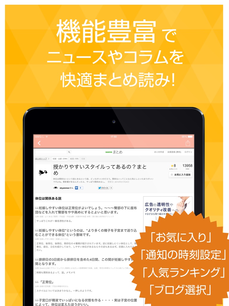 さまざまなサイトから配信される妊活の話題をまとめてチェックできます。