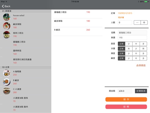 -點菜自動計算金額,並可透過按鈕調整菜色辣,鹹,甜,冰
