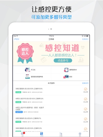感控工作间是由湖南德雅曼达科技公司为医疗机构专门提供的医院感染管理移动工作间,着重在医务人员手卫生、多重耐药菌感染控制措施、导管相关感染预防与控制措施、手术部位感染预防与控制措施等过程干预与培训信息化支撑。