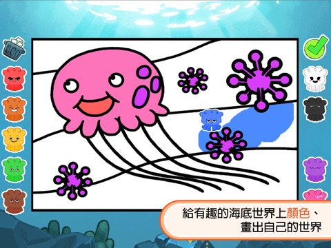 • 可以用烏賊形狀的畫筆,為6個填色畫板上顏色,還有一個空白畫板,讓孩子充分發揮創造力