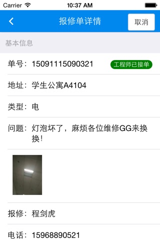 用户通过智能手机安装App,通过上传照片及文字描述上报需要维修的物品。报修后可实时查看报修进度