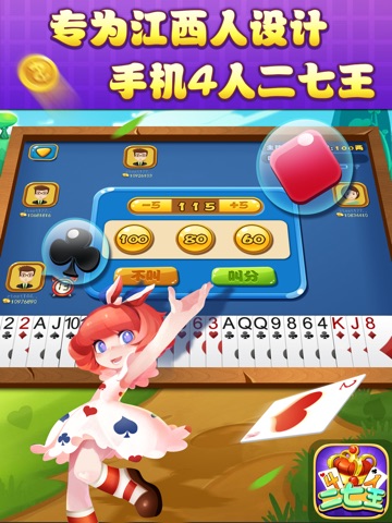 《二七王》是流行于南昌地区的一款扑克类游戏,简单说就是三打一的拖拉机游戏,游戏规定大王,小王,2,7为常主,故名二七王。庄家为一人,其余三人为闲家。 所有牌发完之后开始叫分,叫分最低者为庄家,庄家得到底牌,确定主花色,四个玩家中有一方玩家取得胜利时,视为游戏结束。因游戏打法刺激且极富技巧性,深受广大玩家喜爱!