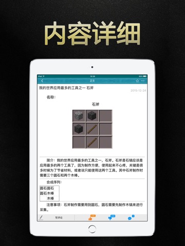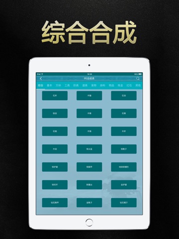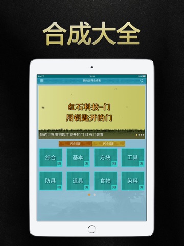 -合成表:囊括了我的世界中的所有的物品的合成方法以及特性讲解,主要分为:基本合成、方块合成、工具合成、防具合成、道具合成、食物合成、染料合成、物品合成、炼金合成、红石合成以及一些其他的合成。