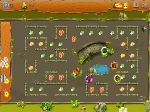 There is a maze with passages in all directions, where hiding a lot of vegetables and fruits,and several fierce arthropods going on patrol as defenders.