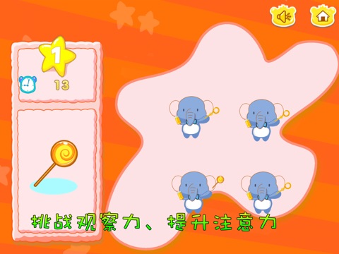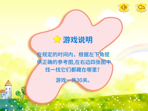 游戏介绍:我左看右看~我上看下看~原来每个东西都不简单~我想了又想我猜了又猜~还是找不到它在哪里。一起动动小手转转眼睛找一找。还有许许多多的东西呢