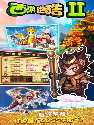 游戏中,你将带领孙悟空、猪八戒、唐僧的降魔队伍,通过跑酷的方式,消灭途中大大小小的妖怪,一路奔袭到牛魔殿,与牛魔王展开生死大决战。