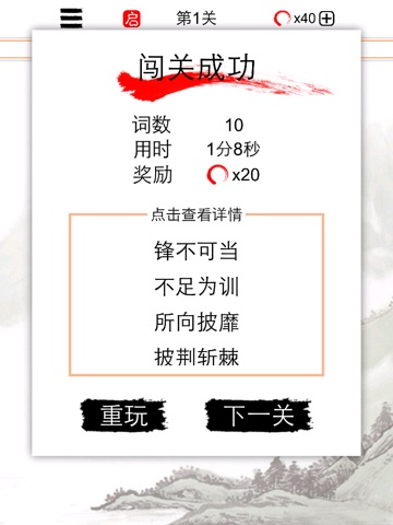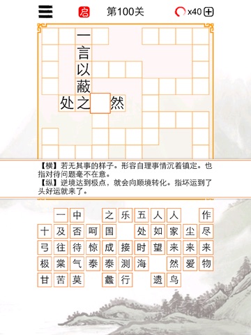 精挑细选的成语词库。改进的填字模式。一边解谜题一边学成语,趣味多多,知识多多。不知不觉中,你就成了成语大师。
