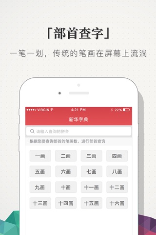 新华字典这是一个查阅20818个汉字(包括简,繁体)的字典程序,是目前为止AppStore中收录汉字*最全*的汉字字典程序。它不但具有笔画,部首索引功能,还具有更强大的逐字搜索能力,一定是您驾驭汉语,提高工作效率的好工具。功能特征:
