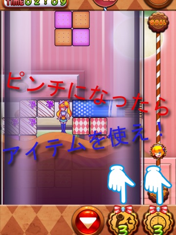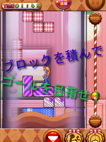 ブロックをタップで回転、左右スワイプで操作し、落下ボタンでパティちゃんが登れるように積み上げていこう!