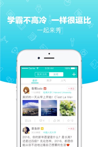 2、我的关注:了解学霸真实生活,真实有趣,一秀全览。