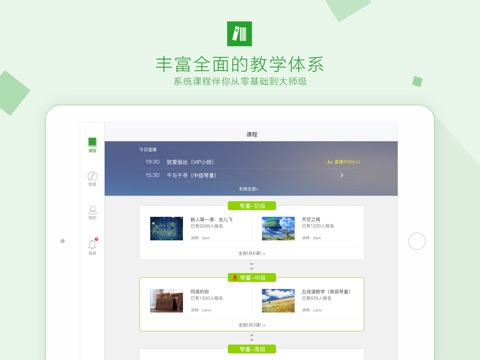 我们有丰富的直播课程+录播视频,毕业于顶尖音乐院校的钢琴老师,轻松愉快的知音社区,让你和全国百万琴友畅游在钢琴的海洋里!