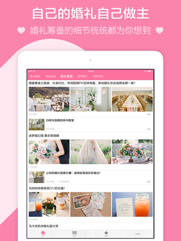 提供创意婚纱照,伴娘服捧花的挑选,婚宴选地等诸多细节的最佳建议,逐一击破婚前难题。