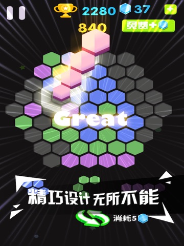 拖动下方任意六边形方块放置在屏幕中即可得分!