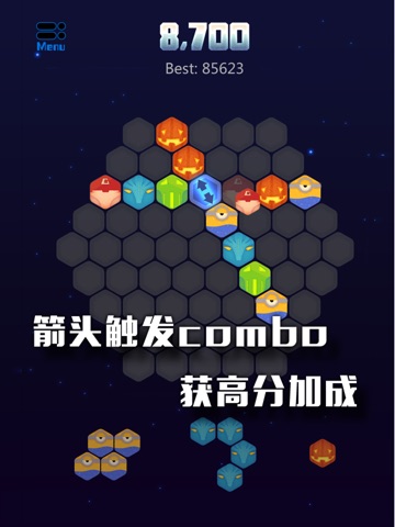 1.玩家只需要将六边形的任何一个方向的旗子摆满,即可消除。