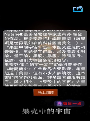 史蒂芬·霍金的前一本宇宙学科普著作《时间简史》在全世界大受欢迎,销量超过千万册。但有不少人评论说,这本书的内容过于艰深,许多读者都没有读完。与之相比,《果壳中的宇宙》大量使用图形来解释宇宙学概念,给读者一种直观印象。史蒂芬·霍金因疾病被困于轮椅上,只能靠语音合成器讲话,却思考着宇宙学最前沿的问题。《果壳中的宇宙》书名源自莎士比亚戏剧《哈姆雷特》的台词:“我即使被关在果壳之中,仍自以为无限空间之王。”对史蒂芬·霍金来说,这句话再合适不过了。