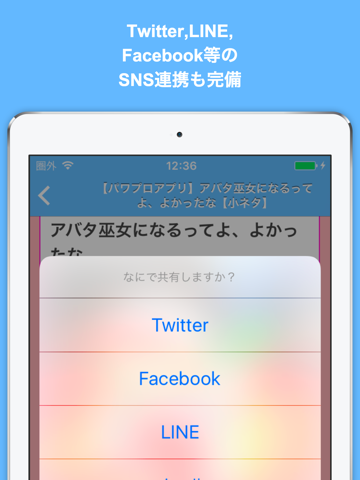 Twitter, Facebook, LINE等のソーシャル連携も万全!どんどんシェアしよう!