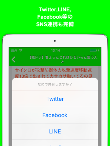 Twitter, Facebook, LINE等のソーシャル連携も万全!どんどんシェアしよう!