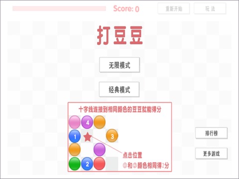 打豆豆是款“有毒”的游戏,在灰白相间的棋盘上,布满了各色相异的豆豆君,而你只需要将其一一打落既可。