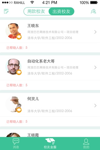 校友金服是一款校友圈社交金融服务平台,以校友情为纽带,为国内顶尖高校在校学生和毕业校友牵线搭桥。