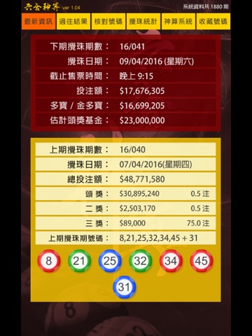 終極神算 - 綜合所有神算機率公式統計出20個號碼.再由聰明組合計算10組號碼,以最高機率博取最大中彩率。