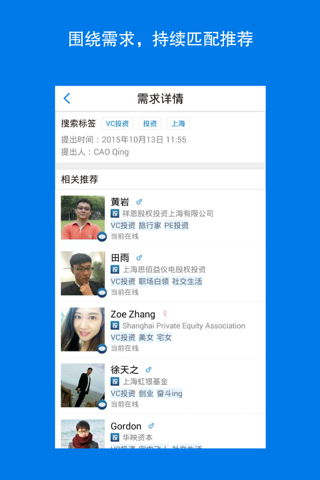 AceBridge中国首个优质众筹平台旗下发布的最新产品,经过六年积累,嘀嘀找人已有250万优质众筹资源,涵盖投资、投行、金融、咨询、律师、媒体广告、创业、移动互联网等各大热门领域,其中1万多名董事长、CEO、创始人,5万多名专业投资人,来自3500多家金融投资机构!