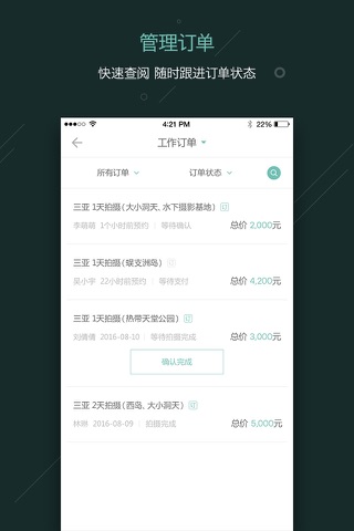 【接单预约】自主报价,体现技术价值;随时接单,与客户在线沟通拍摄流程。