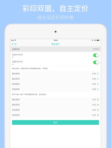 3.一键营业/歇业,自主定价。可根据自己的作息灵活营业/歇业,并且可根据不同打印类型可分别定价。