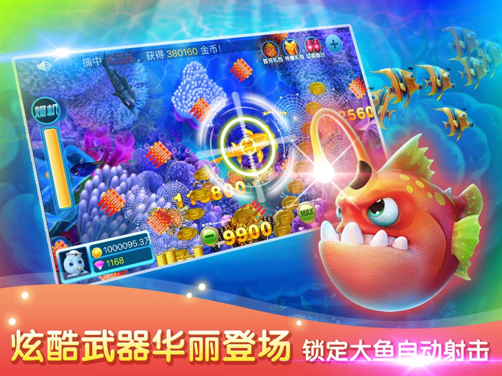 3.街机捕鱼玩法的全新升级,游戏内容更加丰富,爆机模式、精准锁定、自动射击,躺着也能赚金币!