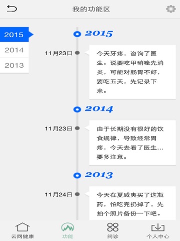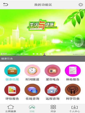 云网健康,随身携带的健康管家。旨在通过手机将您的健康档案存放到云端,终身保存。健康档案包括您平时的病例、体检报告、出院报告,以及您日常健康状态,用药情况随时上传,在时间隧道功能里,可以看到您自记录以来的所有健康日程。此外我们提供了多项健康服务及健康教育,实现健康的自我管理。我们还提供了专家平台和粉丝的交流平台,对一些常见病和多发病进行远程咨询。让您足不出户就能解决健康难题。我们还将不断的推出移动终端设备接口,对您的健康进行量化管理,及运动管理、饮食管理、最终达到健康管理的目的。