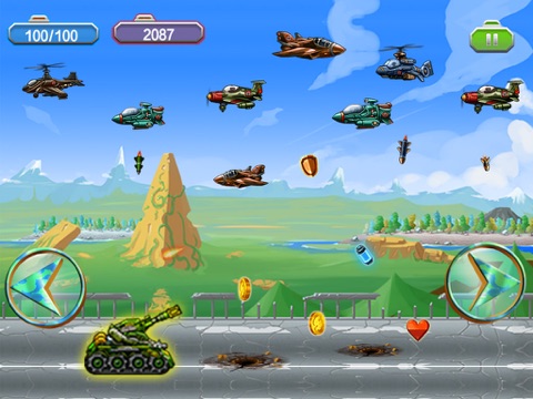 游戏玩法:屏幕下方的左、右按钮可以操控坦克左右移动;移动坦克发射头可以控制其大炮发射方向;尽可能的多吃金币和红心,可以增加你的血量。