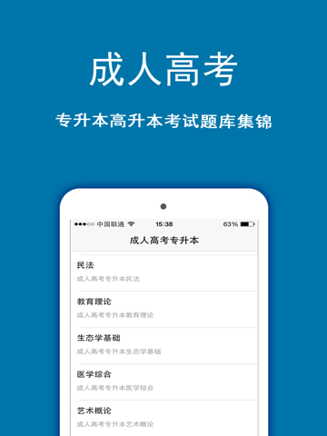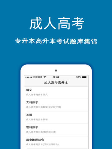 针对成人考试所制定的专业辅导软件,为大家提供全国各类成人高考题库。包括专升本和高升本。其中专升本包括:《大学语文》,《高等数学一》,《高等数学二》,《政治》,《英语》,《民法》,《教育理论》,《生态学基础》,《医学综合》,《艺术概论》。高成本包括:《语文》,《数学》(文史财经类),《英语》,《数学理工类》,《历史地理》,《物理化学综合》
