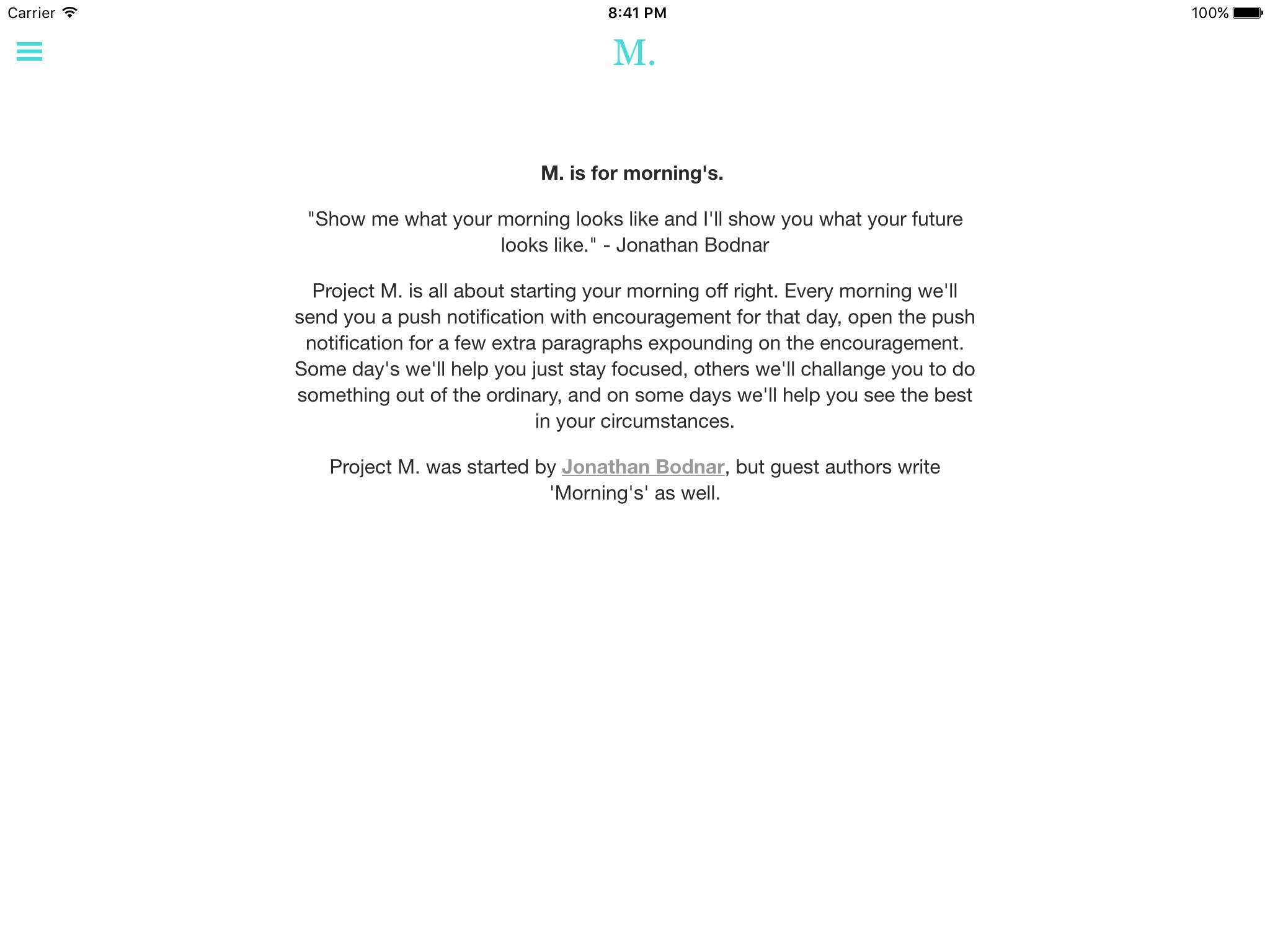 M. sends out a push notification with encouragement every morning, open the notification for a few paragraphs expounding on the encouragement.