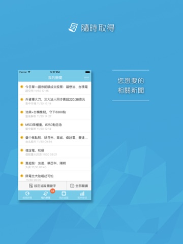 ●"我的新聞",若您每天工作是在茫茫新聞大海中尋覓你要資訊。此APP將會是您的救贖,只要簡單設定關鍵字,系統自動可將各報相關新聞匯集成冊,並隨時提醒您有新的新聞進入。