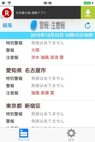 - フィード画面で更新ボタンまたは、下にスワイプで最新の気象警報情報を知る事ができます。