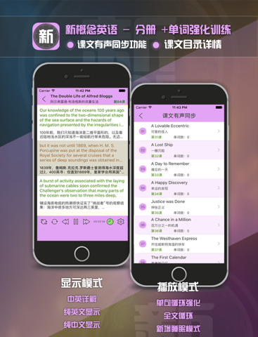 今年最新整合新概念英语全四册,本应用是英语会话听力材料开放式英语学习平台,实现声音文字同步播放,单词训练等功能,注重提高学生掌握4项基本技能--听、说、读、写,课文与单词共同训练,语音和拼写并进。一边听原汁原味的英语朗读,一边看同步显示的课文, 新概念英语绝对是您提高听、说、写的最佳途径。