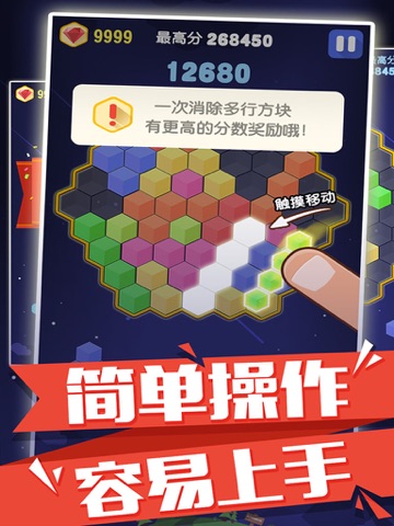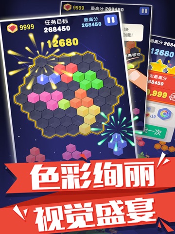 蜂巢消消乐是一款非常具有创意的消除休闲类游戏。游戏中最常出现的就是颜色各异的六边形,拖动各个形状的六角方块放入棋盘中,如果填满任意一行就可以产生消除,而连续消除会有额外Combo加分。棋盘上再也无法摆下任意一个六边形组合的时候,游戏就会失败,游戏规则简单,但趣味无穷。
