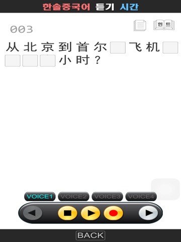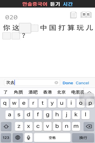 중국 원어민의 발음을 듣고 빈칸에 단어를 채워 문장을 완성합니다. 원어민 발음 듣기연습을 통해 중국어회화 듣기 능력을 향상시키는 어플입니다.