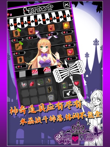 指挥少女们进入皇后城堡,消灭扑克小怪,收集道具,通过锻造附魔提升少女实力。