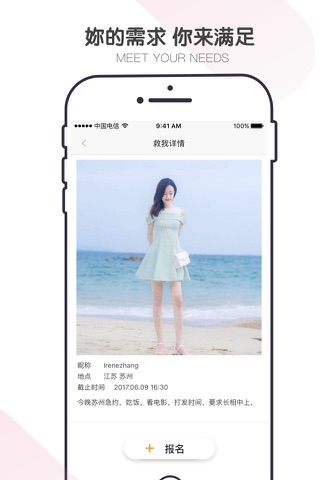 约会需求:平台适时更新女生个人约会需求,男生符合条件即可报名。