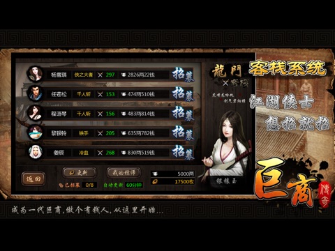镖师系统 - 跑商经常会碰到不怀好意的强盗,去[龙门客栈]雇佣一些镖师是非常不错的选择,击杀盗匪还 可能获得各种稀有珍宝,拿去卖掉可以获得不少银两。