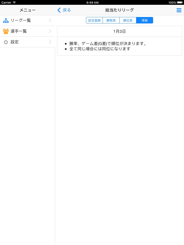 ・リーグ戦の順位、試合結果、グラフ、写真をTwitterやメールなどで共有