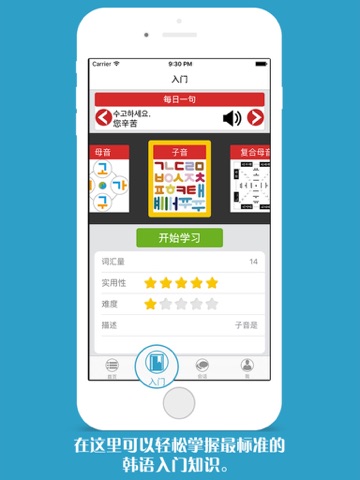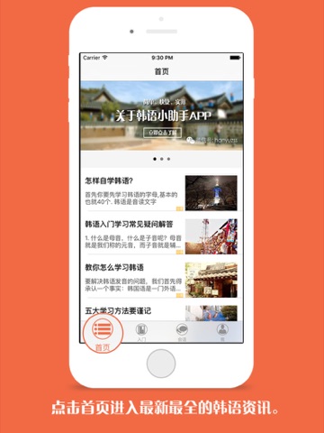 ”韩语门“ 简单明了快速让您掌握韩语发音及韩语音标。包含多种常用韩语单词短语以及韩语发音规则,提供100多种韩语场景对话。完美解决韩语初学者学习遇到的困难。