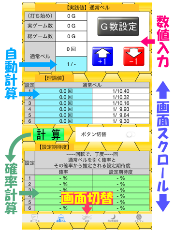 各画面において、ゲーム数および出現したフラグ数をボタンで入力する事で「実践台のフラグの出現確率」および「設定別のフラグの出現理論値」が自動計算されて画面の水色の枠に計算結果が表示されます。