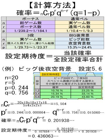 また、計算ボタンを押す事で「実践成績から推定される設定期待度」が画面の緑色の枠に表示されます。