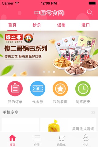 中国零食网iPhone手机版是运营团队精心打造的一款掌上购物客户端,简单顺畅的操作体验让手机用户随时随地享受便捷的手机购物服务,更有手机用户特惠的秒杀活动等着您。