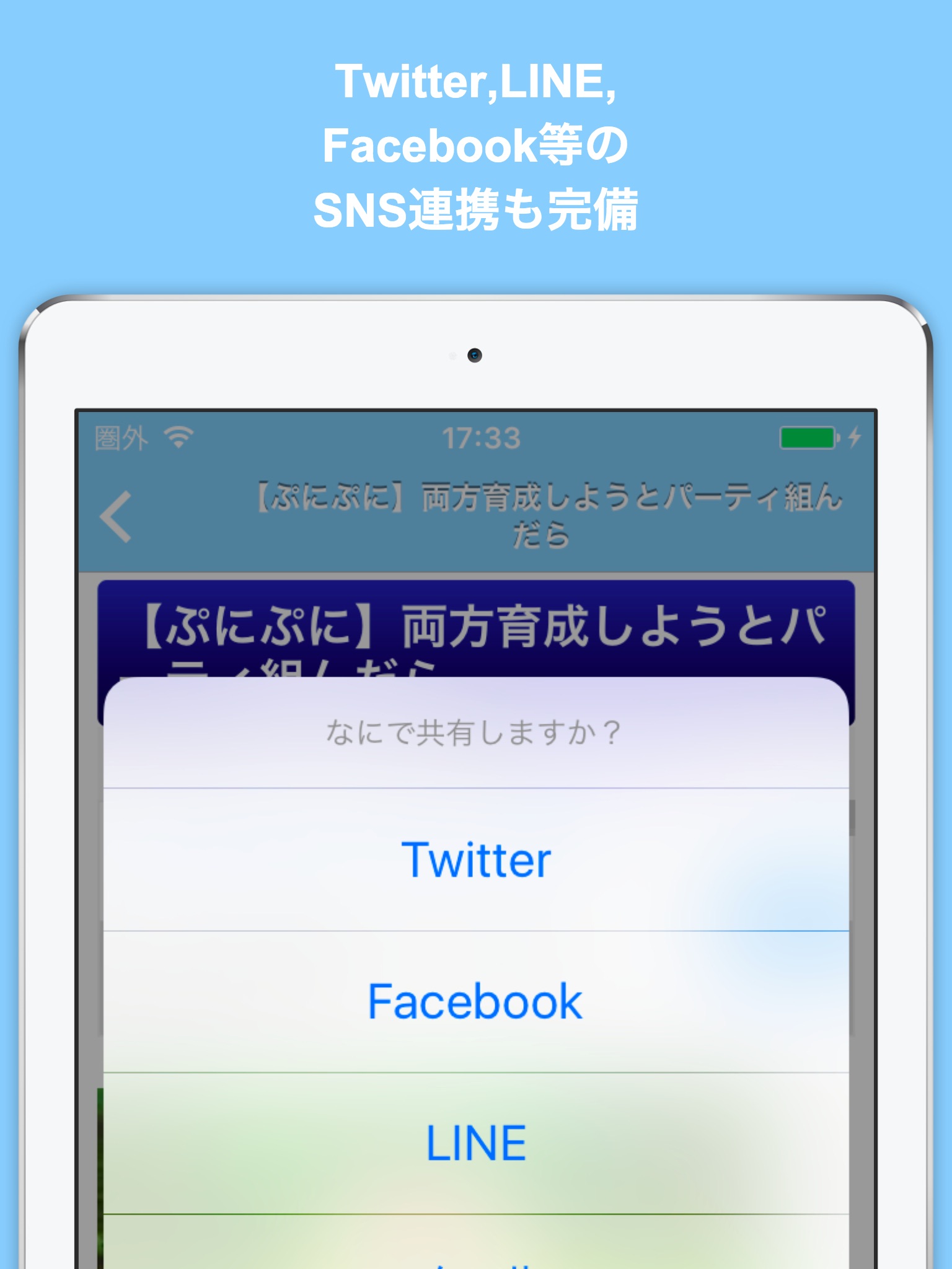 Twitter, Facebook, LINE等のソーシャル連携も万全!どんどんシェアしよう!