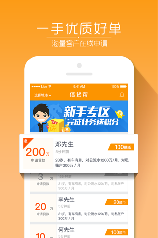 信贷帮,国内领先的信贷员移动展业平台,为信贷员提供风控筛选、智能匹配、实时抢单等服务,是广大信贷员快速获客的必备工具。信贷帮通过庞大的征信数据集、先进的风控模型和专业的获客渠道,向信贷员提供优质的一手贷款名单,大大提升做单的成功率。