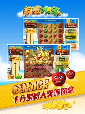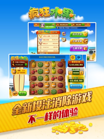 疯狂水果(英文名:funky fruits;又名水果派对)是一款极具创意的投注消除类游戏,游戏是5X5区域,共6个水果,5个以上水果相连即可得分。最刺激的全服连线彩金池不间断爆彩,8个以上樱桃即可触发。如今,又增加了双人对战功能,更增加了趣味性。相信玩过BBIN和PT平台的玩家对这种玩法早已熟悉。