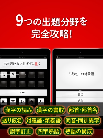 「読み」「書取」「部首」「送り仮名」「対義語・類義語」「同音・同訓異字」「誤字訂正」「四字熟語」「熟語の構成」の9分野、