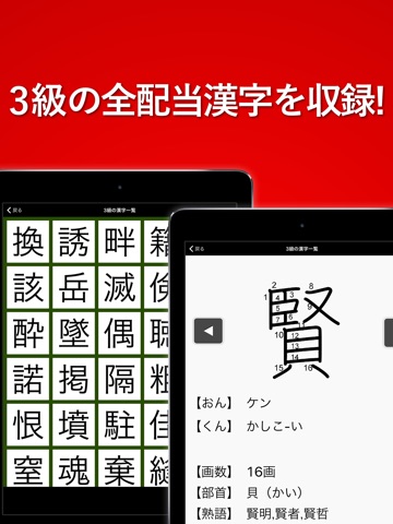 さらに、漢検3級から出題対象となる全284漢字の一覧表示機能を搭載。
